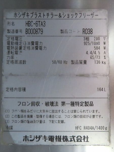 H1180◆ホシザキ◆ブラストチラー&ショックフリーザー HBC-6TA3