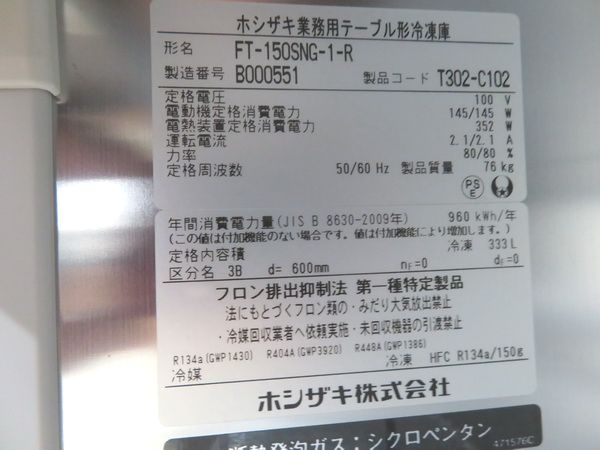 H1273◆ホシザキ 2022年◆冷凍コールドテーブル FT-150SNG-1-R 100V