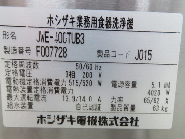 H1313◆ホシザキ◆食器洗浄機 JWE-400TUB3