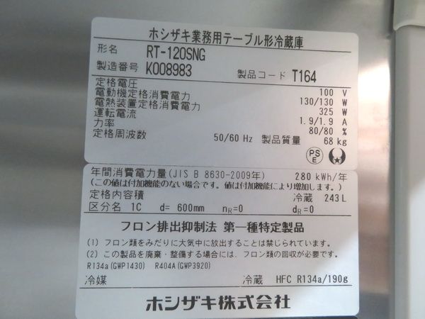 H1342◆ホシザキ 2020年◆サンドイッチ冷蔵コールドテーブル RT-120SNG