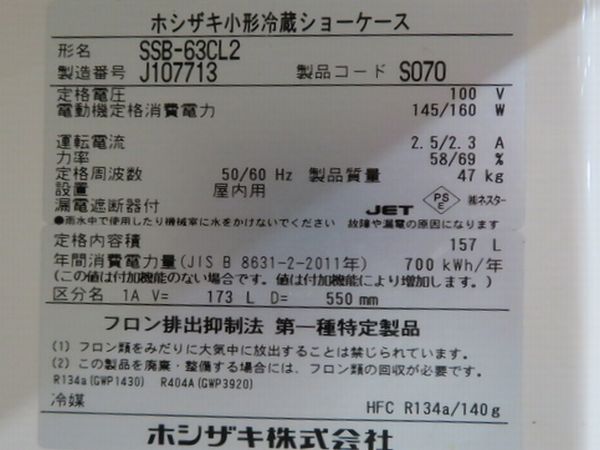 H1349◆ホシザキ 2019年◆小形冷蔵ショーケース SSB-63CL2 100V