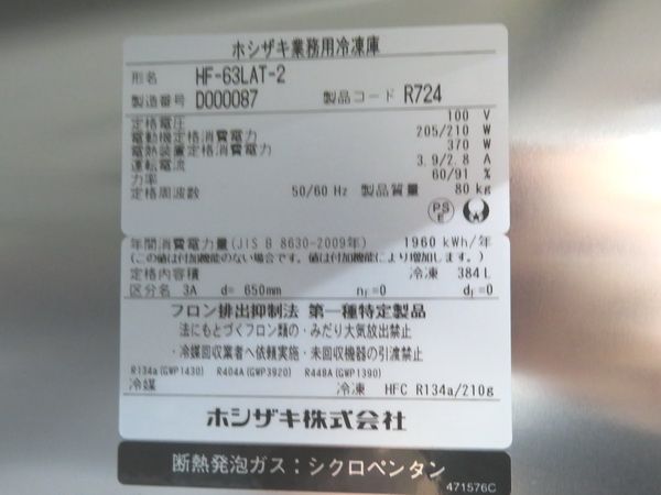 H1359◆ホシザキ 2024年◆2ドア冷凍庫 HF-63LAT-2 100V