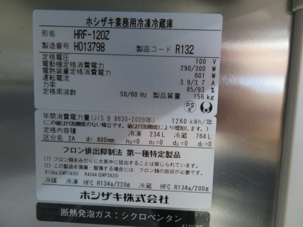 H1376◆ホシザキ◆4ドア冷凍冷蔵庫 HRF-120Z