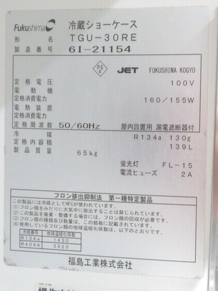 H1636◆フクシマ◆テーブル型冷蔵ショーケース TGU-30RE