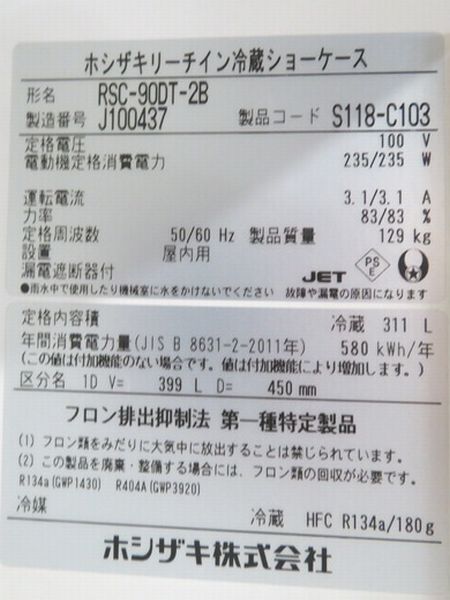 H1524◆ホシザキ 2019年◆リーチイン冷蔵ショーケース RSC-90DT-2B