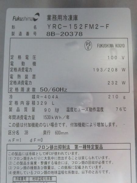 H1529◆フクシマガリレイ◆冷凍コールドテーブル YRC-152FM2-F