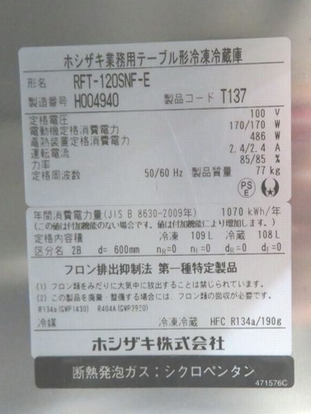 H1536◆ホシザキ◆冷凍冷蔵コールドテーブル RFT-120SNF-E