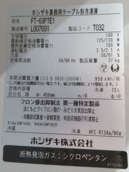 H1476◆ホシザキ 2021年◆冷凍コールドテーブル FT-63PTE1