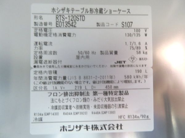 H1755◆ホシザキ 2025年◆テーブル形冷蔵ショーケース RTS-120STD 100V