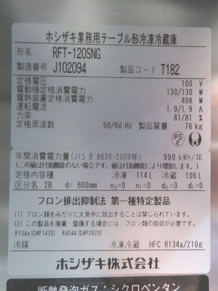 J016◆ホシザキ 2019年◆冷凍冷蔵コールドテーブル RFT-120SNG