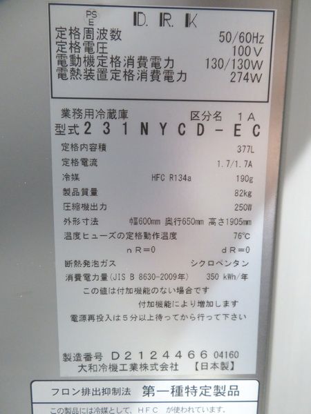 冷機器 > 縦型冷蔵庫