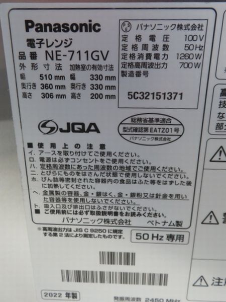 J057◆パナソニック 2022年◆電子レンジ NE-711GV 100V50Hz
