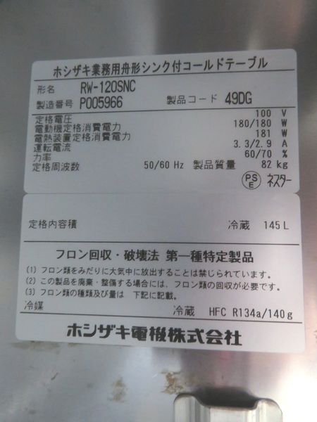 J228◆ホシザキ◆舟形シンク付冷蔵コールドテーブル RW-120SNC 100V