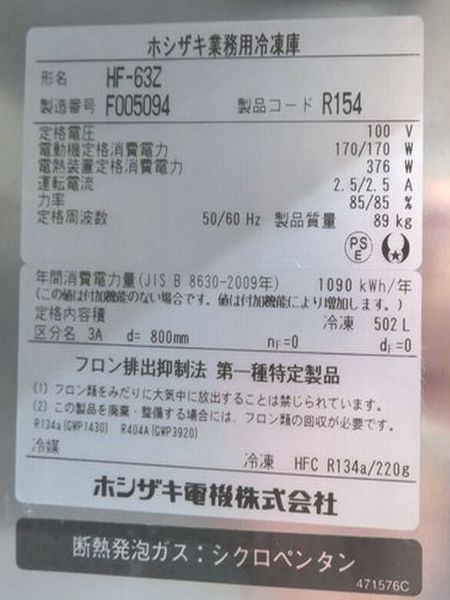 J208◆ホシザキ◆2ドア冷凍庫 HF-63Z