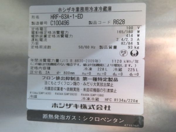 J311◆ホシザキ 2023年◆2ドア冷凍冷蔵庫 HRF-63A-1-ED 100V