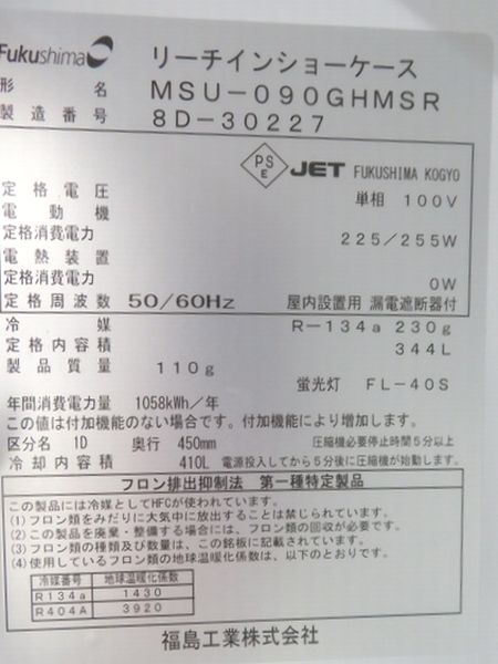J313◆フクシマ 2018年◆リーチイン冷蔵ショーケース MSU-090GHMSR 100V