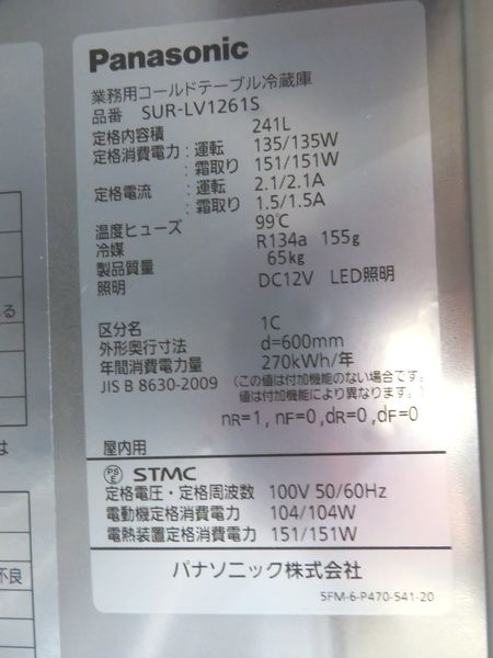 J317◆パナソニック 2026年◆冷蔵コールドテーブル SUR-LV1261S 100V