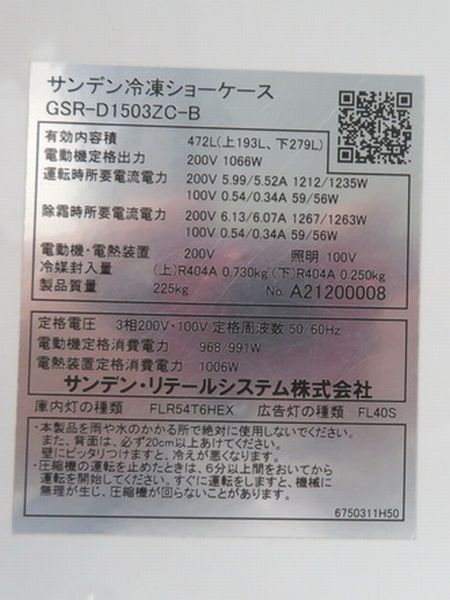 J363◆サンデン 2021年◆デュアル型冷凍ショーケース アイスショーケース GSR-D150