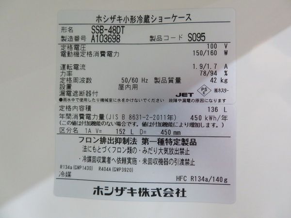 J397◆ホシザキ 2021年◆小形冷蔵ショーケース SSB-48DT 100V