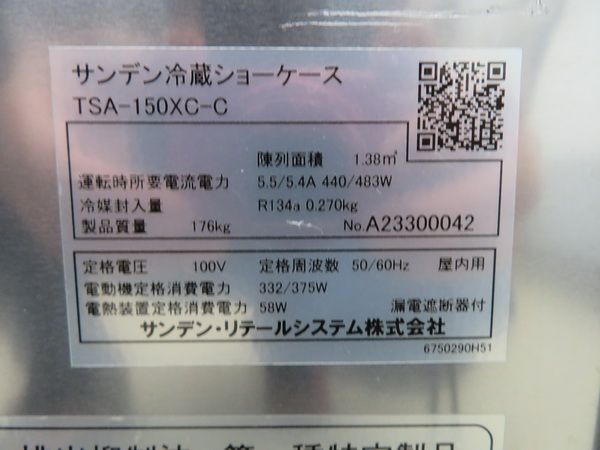 J399◆サンデン 2023年◆冷蔵ショーケース(高湿タイプ) TSA-150XC-C 100V